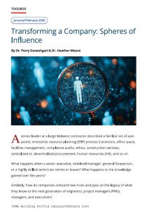 ![]() | Transforming a Company: Spheres of Influence | CFMA | Dr. Perry Daneshgari and Dr. Heather Moore | January - February | 2026 | A senior leader at a large Midwest contractor described a familiar set of pain points: enterprise resource planning (ERP) process transitions, office space, facilitates management, compliance audits, ethics, construction services, centralized vs. decentralized procurement, human resources (HR) and so on. | Read |